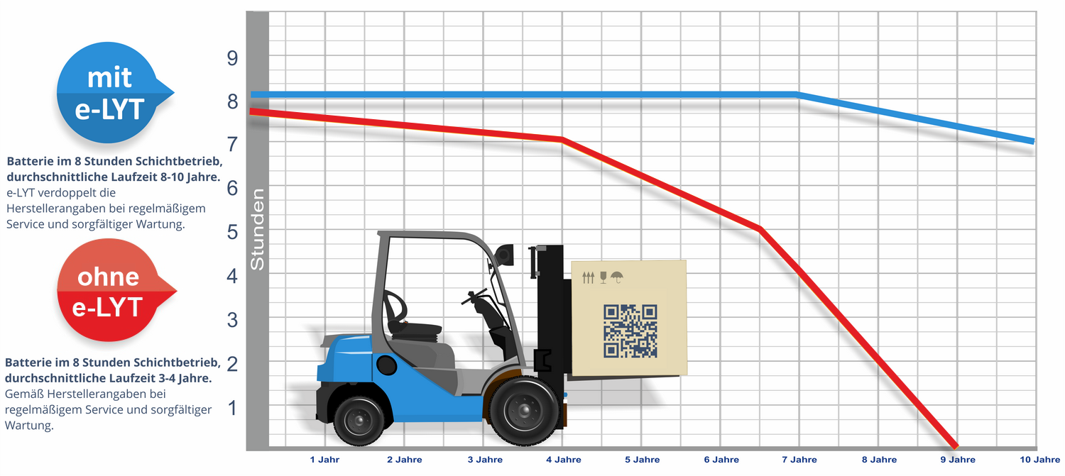 e-LYT verdoppelt die zu erwartende Lebensdauer der Batterie.